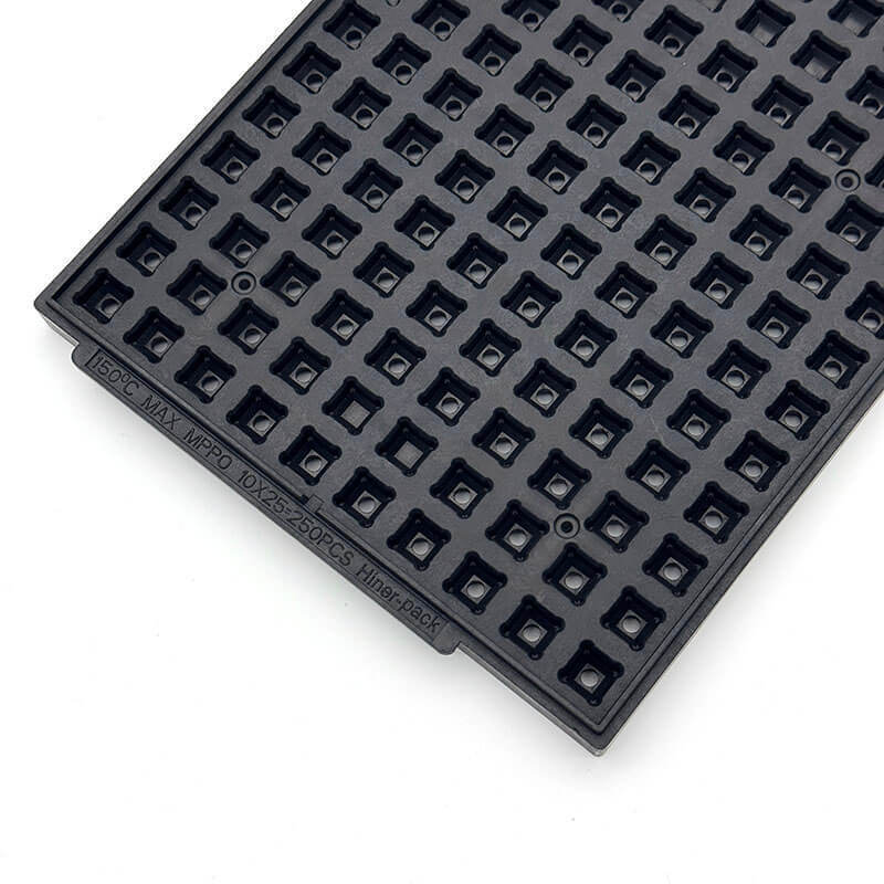 ถาดเป็นไปตามขนาด JEDEC มาตรฐาน ทำให้มั่นใจได้ถึงความเข้ากันได้กับอุปกรณ์จัดการอัตโนมัติและกระบวนการผลิตเซมิคอนดักเตอร์